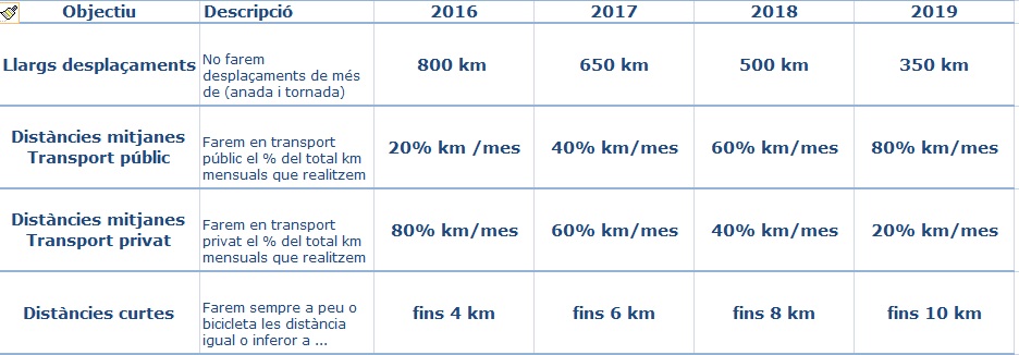 - En els desplaçaments inferiors al que he establert com a llarga distància progressivament aniré combinant el % dels que faig en transport privat i transport públic de manera que al final del període de quatre anys passaré a fer un 80% d’aquests desplaçaments en transport públic i només un 20% en transport privat.